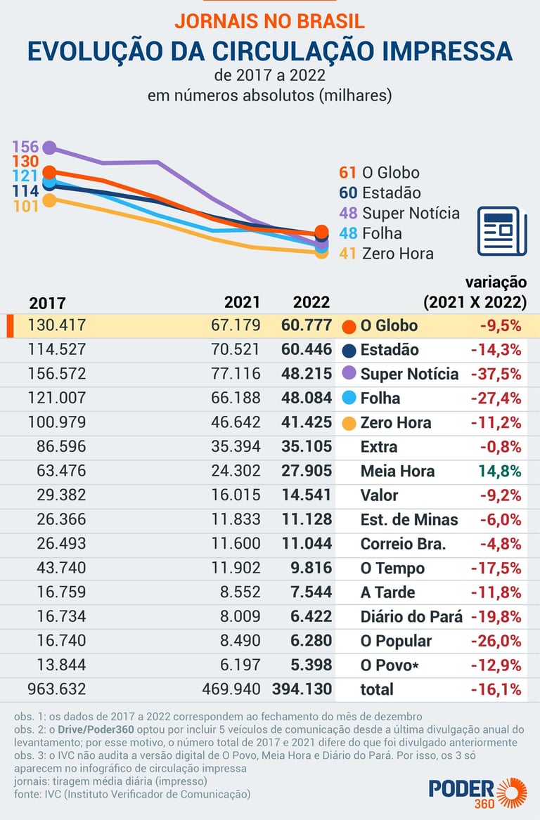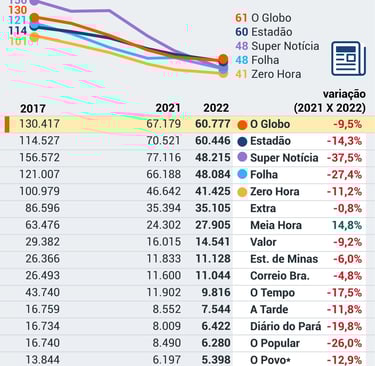 Note that the newspaper O Estado de São Paulo had 114,527 subscribers and readers in 2017, reaching 60,446 in 2022. This is even in the post-pandemic period, when the old media still gained some survival. Thus, the gigantic structure of the newspaper, which was maintained by 114 thousand subscribers in 2017, today needs to be maintained by only 60 thousand. And my experience as a journalist tells me that these numbers are manipulated, that is, the real number of subscribers is even lower. And yet “O Estado de São Paulo” persists, attacking right-wing groups that seek to save the country from the communist corruption that is spreading with the Workers' Party and its allies in Congress, such as the PSD, MDB and PSDB.