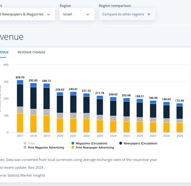 Future Press has “future” in its name, so we make it our calling. But before we talk about “future,” take a look at this infographic developed by the statistics firm Statista Market Insight. The infographic shows the decline of printed newspapers and magazines in Israel. The decline is visible to the naked eye, but there are important aspects that can be seen in the details.